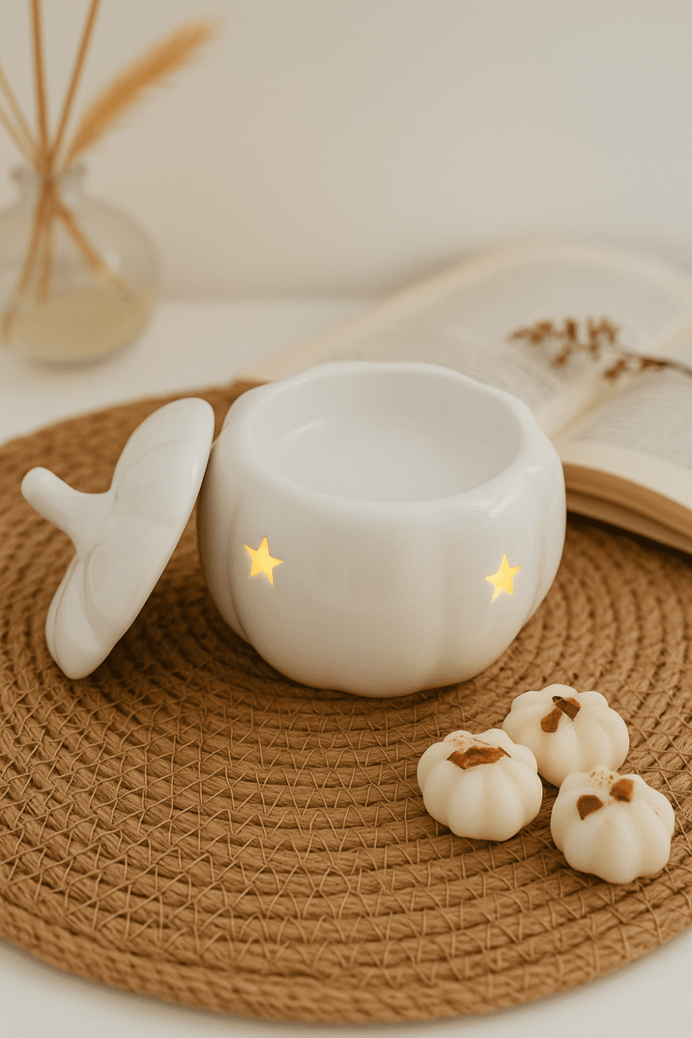Ce brûle-parfum citrouille en céramique blanche, c’est le détail déco qui change tout : il diffuse une lumière douce à travers ses petites étoiles et crée instantanément une atmosphère réconfortante.