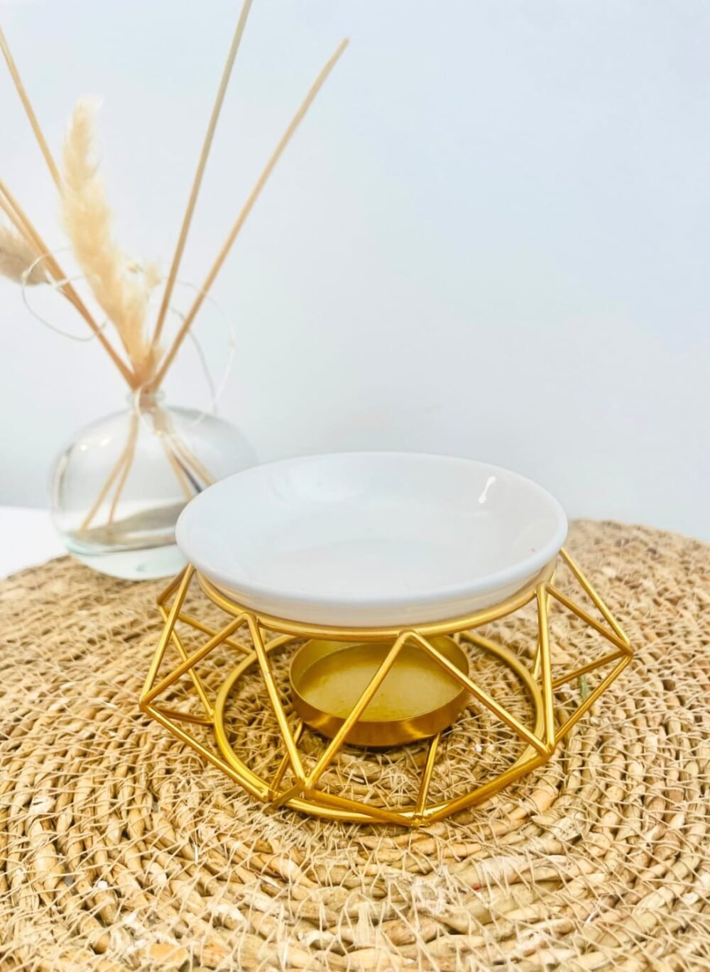 Apportez une touche raffinée à votre intérieur avec le brûle-parfum Isis, un diffuseur au design moderne et élégant. Son cadre doré géométrique et sa coupelle en céramique blanche en font un objet décoratif à la fois chic et fonctionnel. Idéal pour diffuser vos fondants parfumés, il libère délicatement les senteurs pour créer une ambiance cocooning et relaxante